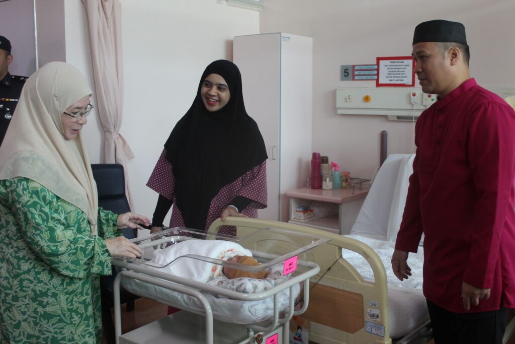SEREMBAN – Tengku Ampuan Pahang, Tunku Azizah Aminah Maimunah Iskandariah mencemar duli melawat bayi ke-151 hasil rawatan persenyawaan tabung uji (IVF) tajaan Yayasan Fertiliti Tunku Azizah (TAFF) di Hospital Tuanku Jaafar (HTJ), di sini, hari ini.