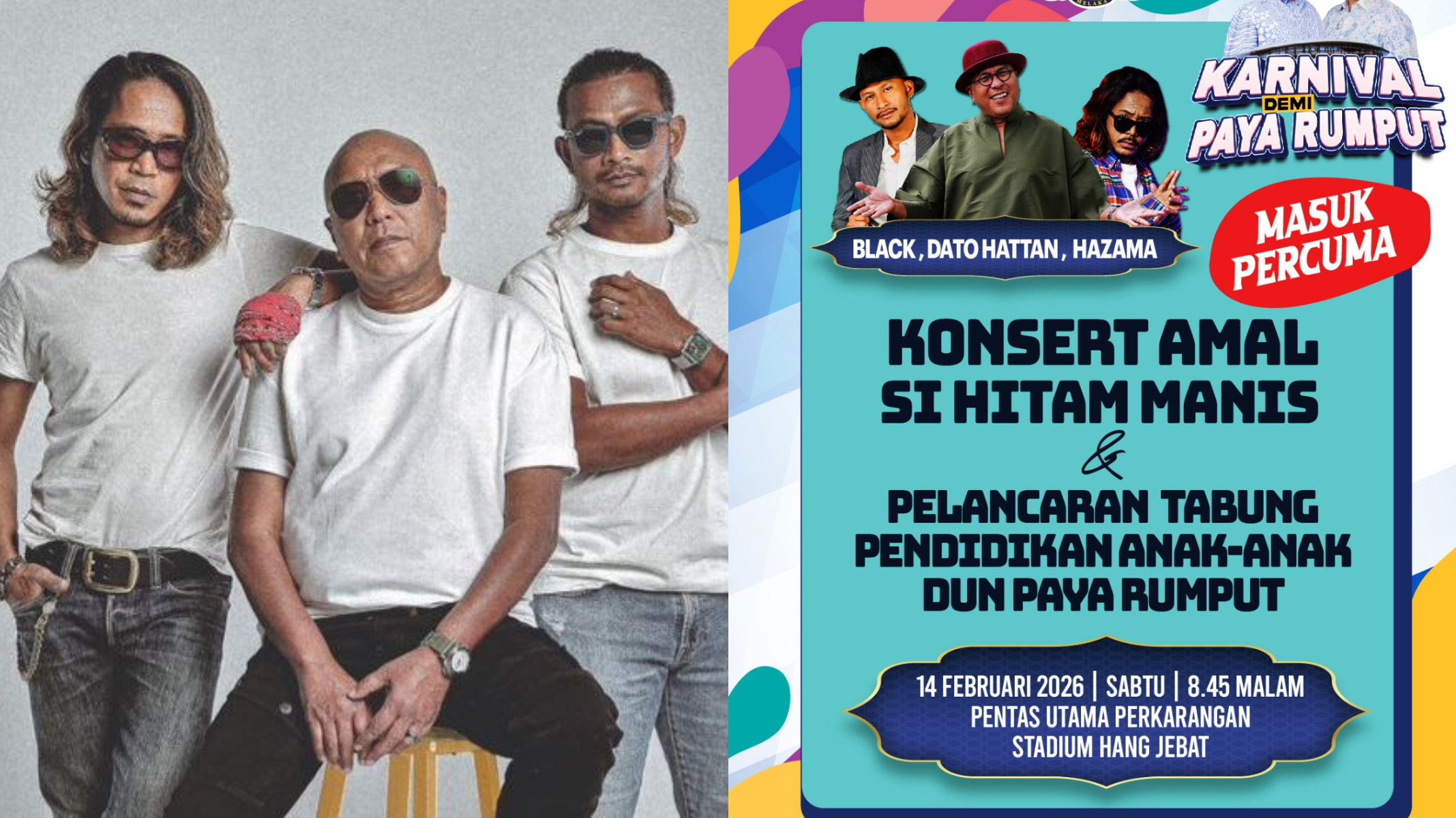 MELAKA: Kehadiran Datuk Hattan, Black Hanifah dan Hazama dijangka menjadi tarikan utama menerusi Konsert Amal Si Hitam Manis sempena Karnival Demi Paya Rumput yang berlangsung dari 8 hingga 15 Februari di Stadium Hang Jebat, di sini. Konsert amal yang menawarkan kemasukan percuma itu dijadualkan berlangsung pada 14 Februari ini, pukul 8.45 malam di Pentas Utama … Read more