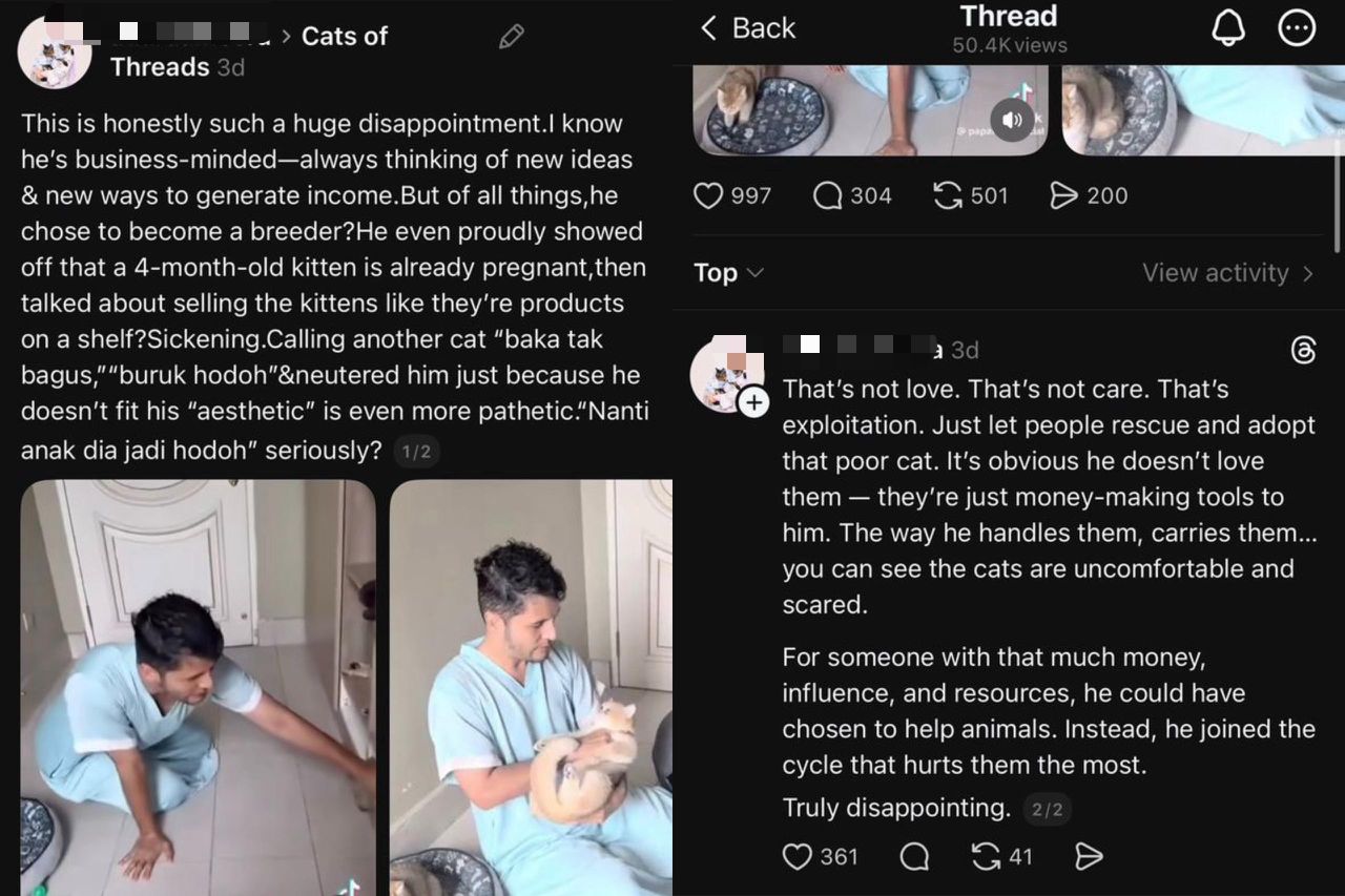 Terdahulu, kecoh dalam Threads apabila netizen meluahkan rasa kecewa selepas bapa enam anak itu mahu menjual kucing mengandung selain menyifatkan haiwan itu sebagai baka tidak bagus, buruk dan hodoh.
