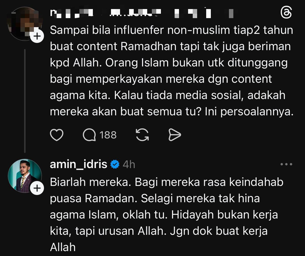 TANGKAP layar Amin membalas komen seorang pengguna Thread berkenaan pempengaruh bukan Islam rancak memuat naik konten Ramadan.