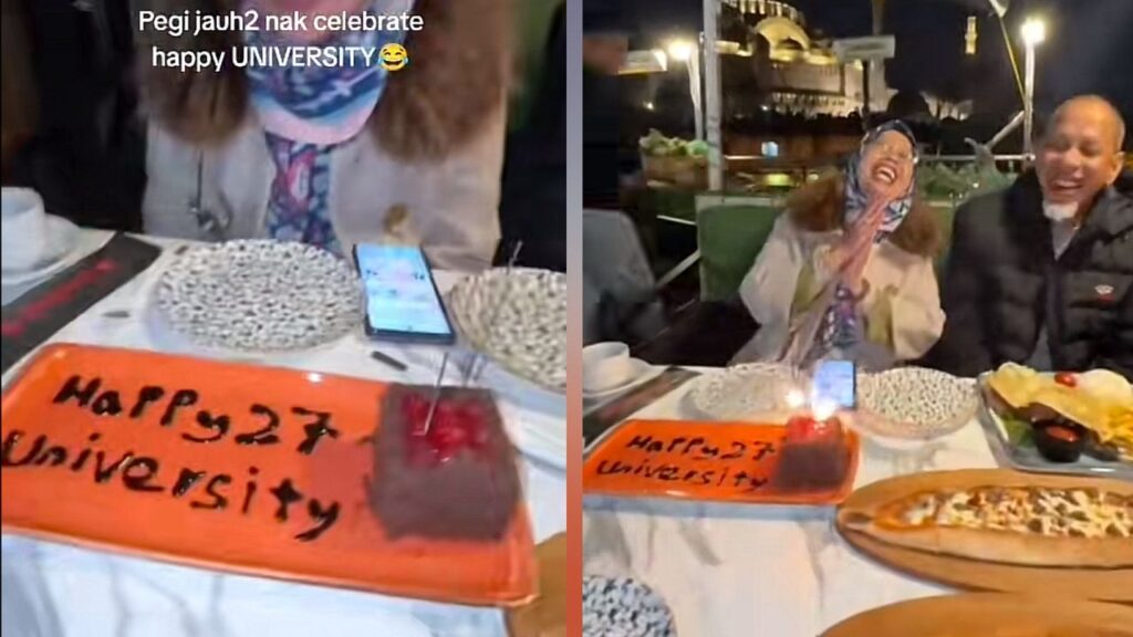 “Pergi jauh-jauh nak sambut Happy University. Siapa pernah? Kita gelak saja tak perlu marah. Selamat ulang tahun suamiku,” tulisnya di ruangan kapsyen.