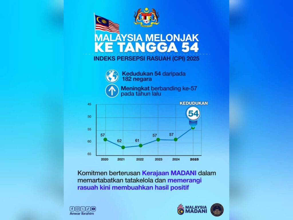 PETALING JAYA – Perdana Menteri memaklumkan, kedudukan Malaysia dalam Indeks Persepsi Rasuah (CPI) dunia melonjak ke kedudukan 54 ketika ini.