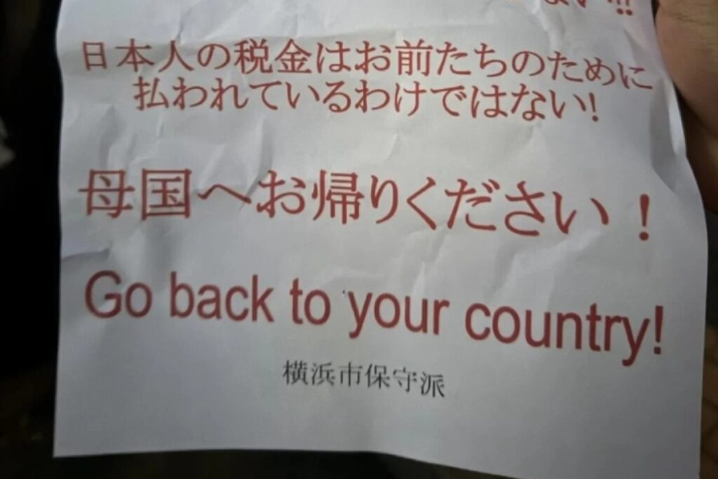 Pada nota itu, ia ditulis iaitu “Faksi Konservatif Bandar Yokohama, kepada warga asing, sila tinggalkan Jepun. Kamu tidak dialu-alukan di sini. Jepun tidak perlukan imigran. Cukai rakyat Jepun bukan untuk kamu. Pulanglah ke negara kamu”.
