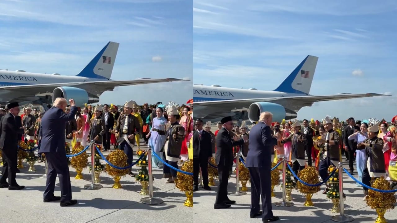 Menerusi hantaran pengguna @MargoMaetin47 di aplikasi X, ketibaan Trump kira-kira pukul 9.54 pagi itu disambut oleh Perdana Menteri, Datuk Seri Anwar Ibrahim serta kumpulan tarian tradisional.