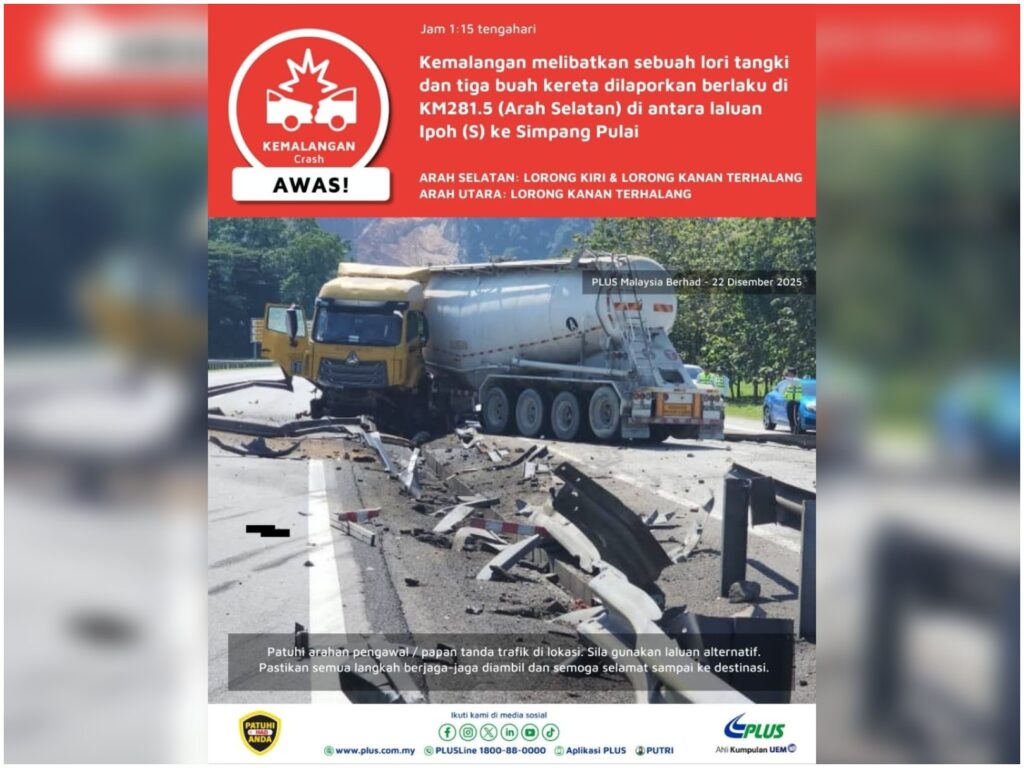 Plus Malaysia Berhad (Plus) menerusi aplikasi X memaklumkan, kejadian itu mengakibatkan trafik sesak apabila satu lorong arah utara dan dua lorong arah selatan terhalang.