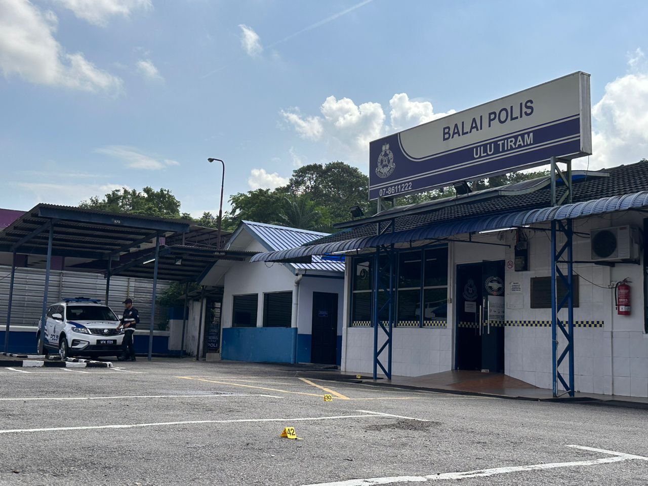 Ketua Balai Polis Ulu Tiram, Inspektor Mohd Hisham Ezahar, 38, berkata, ketika itu, dia melihat mangsa mengalami pendarahan di kepala berdekatan kereta perisai berhadapan bangunan kaunter pertanyaan di balai polis itu.