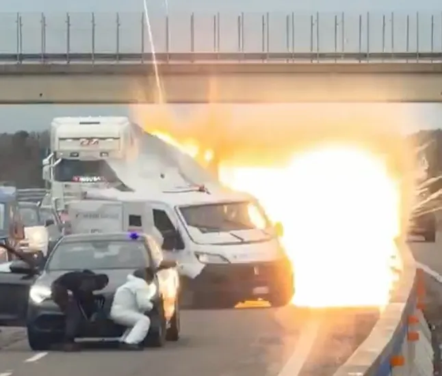 ROM – Sekumpulan perompak bersenjatakan raifal meletupkan sebuah van keselamatan dalam serbuan mengejut di tengah-tengah sebuah lebuh raya di Itali, lapor akhbar Metro UK.