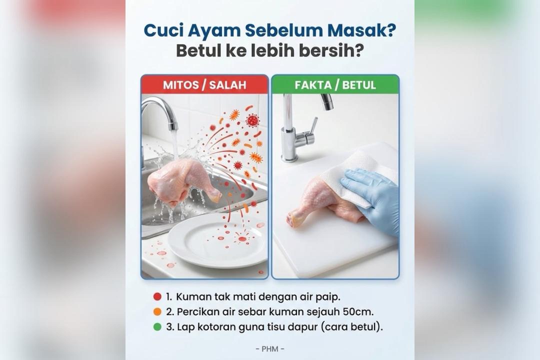 Tambah PHM, risiko utama amalan membasuh ayam adalah percikan air yang terkena permukaan ayam mentah. Titisan halus itu boleh merebak ke kawasan sekitar sinki dan melekat pada tangan, permukaan dapur, pinggan, papan pemotong serta makanan yang sudah sedia dimakan.