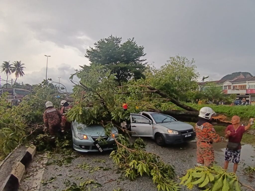 IPOH – Enam individu yang menaiki tiga buah kereta berdepan detik cemas apabila ribut kencang menyebabkan pokok tumbang lalu menghempap kenderaan mereka di Taman Bersatu, Simpang Pulai, di sini hari ini.