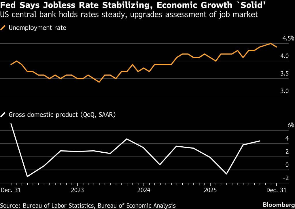 After the Fed kept borrowing costs on hold Wednesday, Powell talked up a “clear improvement” in the US outlook and said the job market shows signs of steadying. It signals a cautious optimism: Fed officials delivered three cuts last fall, and see nothing in the latest data to suggest more are needed to prop up the economy. Futures markets expect no shift in rates before June.