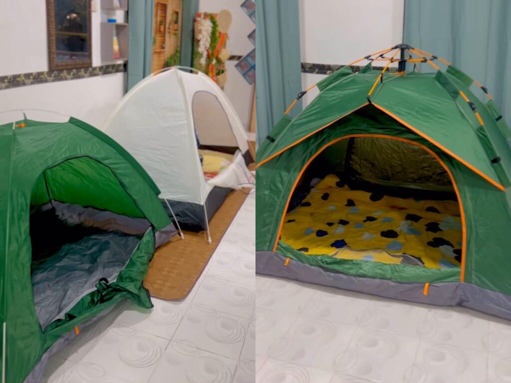 Meskipun tidur di dalam khemah, faktor keselesaan tetap diutamakan apabila pemilik hantaran menjelaskan bahawa khemah tersebut dilengkapi dengan kipas bagi mengelakkan cuaca panas.